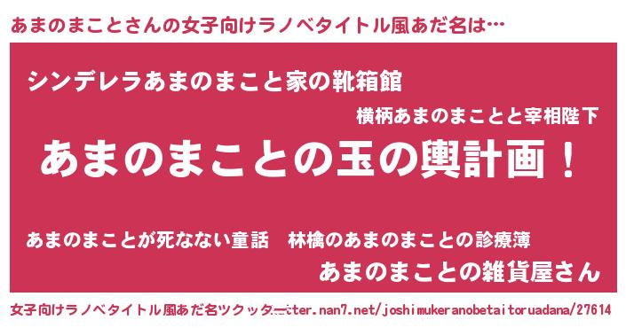 | 男性向けラノベタイトル風あだ名 | 『あまのまこと~年齢イコール彼女いない歴の魔法使い~』 |