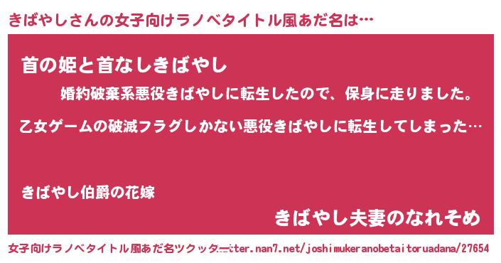 | 男性向けラノベタイトル風あだ名 | 『この素晴らしい世界にきばやしを!』 |