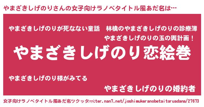 | 男性向けラノベタイトル風あだ名 | 『おまえをオタクにしてやるから、俺をやまざきしげのりにしてくれ! 』 |