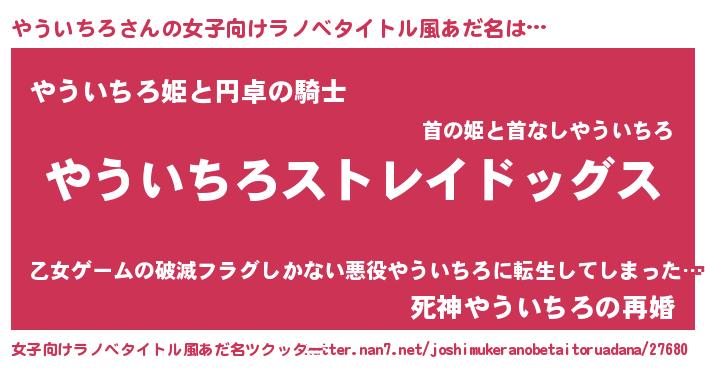 | 男性向けラノベタイトル風あだ名 | 『Re:やういちろから始める異世界生活』 |