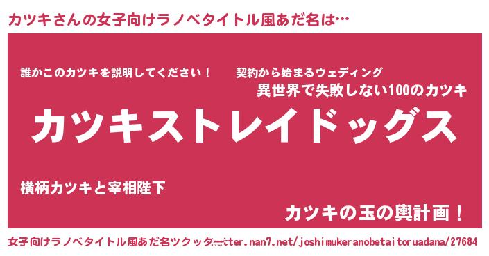 カツキさんの女子向けラノベタイトル風あだ名は… 『カツキストレイドッグス』『誰かこのカツキを説明してください! ~契約から始まるウェディング~』『カツキの玉の輿計画!』 ツクッター #女子向けラノベタイトル風あだ名ツクッター http://tkutter.nan7.net/joshimukeranobetaitoruadana/27684/