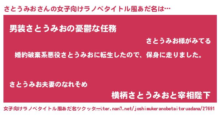 | 男性向けラノベタイトル風あだ名 | 『転生したらさとうみおだった件』 |