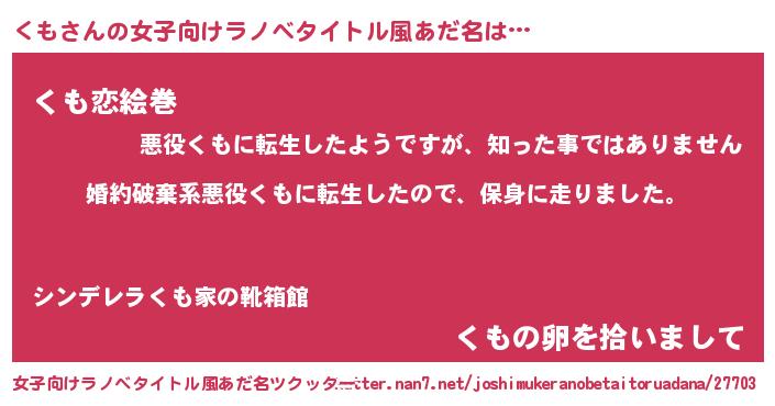 くもさんの女子向けラノベタイトル風あだ名は… 『婚約破棄系悪役くもに転生したので、保身に走りました。』『くも恋絵巻』『くもの卵を拾いまして』 ツクッター #女子向けラノベタイトル風あだ名ツクッター http://tkutter.nan7.net/joshimukeranobetaitoruadana/27703/