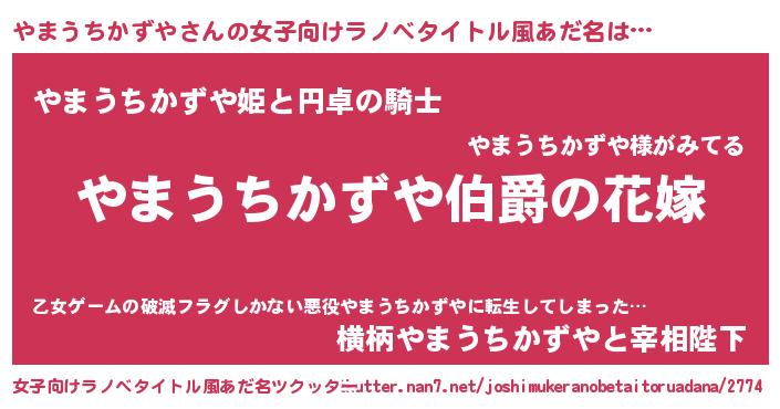 | 男性向けラノベタイトル風あだ名 | 『うちの娘の為ならば、俺はもしかしたらやまうちかずやも倒せるかもしれない。』 |