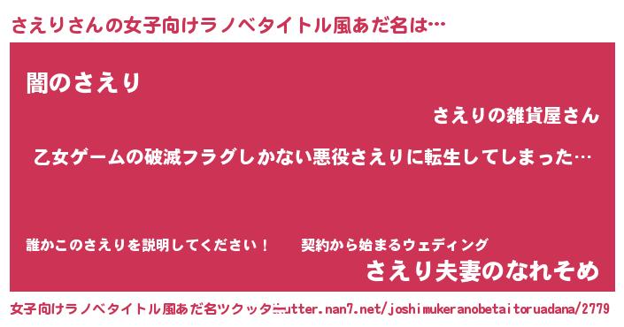 さえりさんの女子向けラノベタイトル風あだ名は… 『乙女ゲームの破滅フラグしかない悪役さえりに転生してしまった…』『闇のさえり』『さえり夫妻のなれそめ』 ツクッター #女子向けラノベタイトル風あだ名ツクッター http://tkutter.nan7.net/joshimukeranobetaitoruadana/2779/