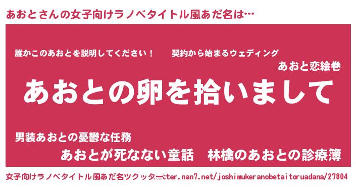 | 男性向けラノベタイトル風あだ名 | 『ダンジョンにあおとを求めるのは間違っているだろうか』 |