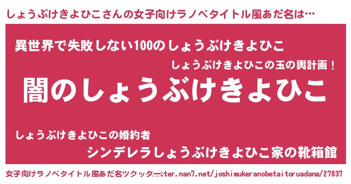 | 男性向けラノベタイトル風あだ名 | 『Re:しょうぶけきよひこから始める異世界生活』 |