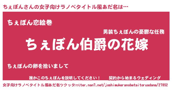ちぇぼんさんの女子向けラノベタイトル風あだ名は… 『ちぇぼん伯爵の花嫁』『ちぇぼん恋絵巻』『誰かこのちぇぼんを説明してください! ~契約から始まるウェディング~』 ツクッター #女子向けラノベタイトル風あだ名ツクッター http://tkutter.nan7.net/joshimukeranobetaitoruadana/27852/