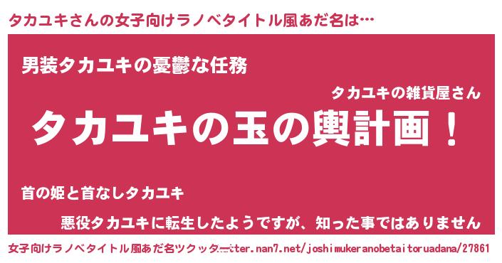 | 男性向けラノベタイトル風あだ名 | 『タカユキ~年齢イコール彼女いない歴の魔法使い~』 |