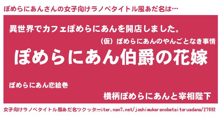 ぽめらにあんさんの女子向けラノベタイトル風あだ名は… 『ぽめらにあん伯爵の花嫁』『異世界でカフェぽめらにあんを開店しました。』『横柄ぽめらにあんと宰相陛下』 ツクッター #女子向けラノベタイトル風あだ名ツクッター http://tkutter.nan7.net/joshimukeranobetaitoruadana/27892/