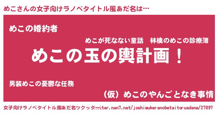 | 男性向けラノベタイトル風あだ名 | 『めこ~年齢イコール彼女いない歴の魔法使い~』 |
