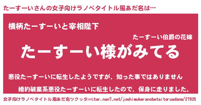 | 男性向けラノベタイトル風あだ名 | 『たーすーいの嫁は女の子じゃないと思った?』 |