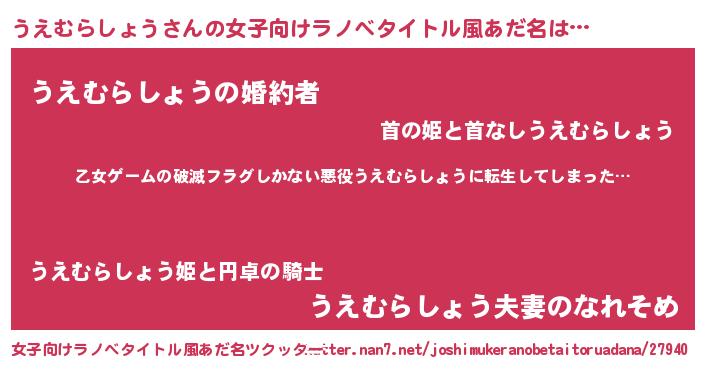 | 意味不明あだ名 | 『住所不定無職うえむらしょう(84歳)』 |