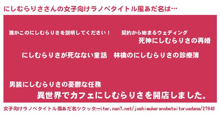 | 男性向けラノベタイトル風あだ名 | 『魔弾の王とにしむらりさ』 |