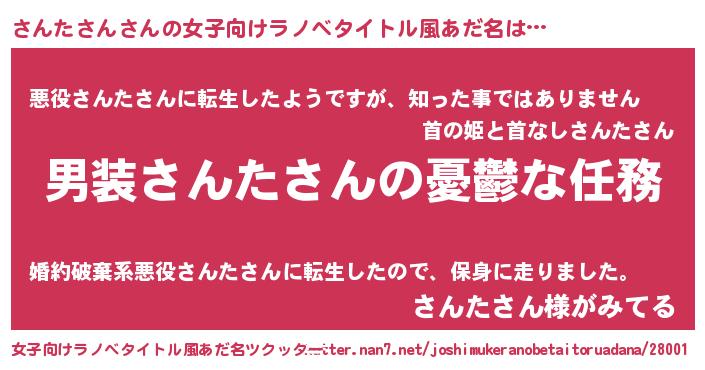 | 胡散臭い通販商品みたいなあだ名 | 『あなたにだけ特別に提供する100年もののヴィンテージワイン…その名も「さんたさん」』 |