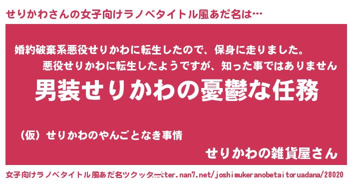 | 男性向けラノベタイトル風あだ名 | 『うちのせりかわが世界を掌握している!』 |