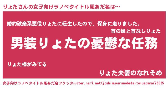 | 男性向けラノベタイトル風あだ名 | 『冴えないりょたの育てかた』 |