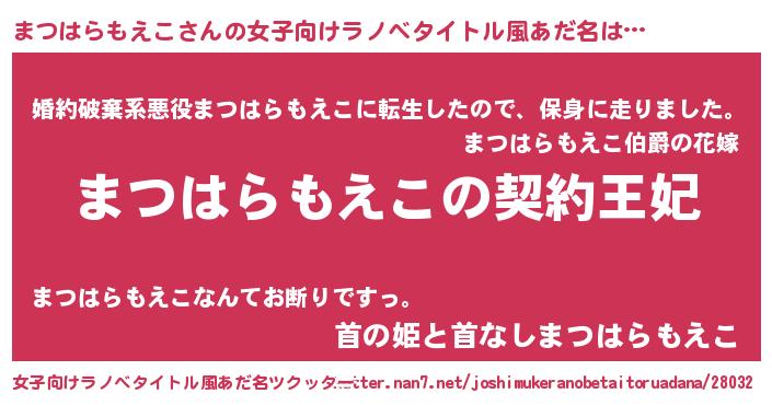 | 胡散臭い通販商品みたいなあだ名 | 『来世でも幸せになれる水素水…その名も「まつはらもえこ」』 |