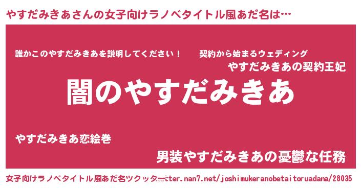 | 男性向けラノベタイトル風あだ名 | 『Re:やすだみきあから始める異世界生活』 |