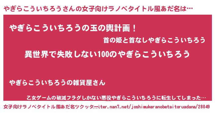 | 男性向けラノベタイトル風あだ名 | 『やぎらこういちろうという概念が存在しない退屈な世界 』 |