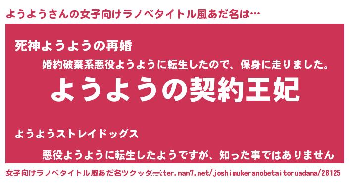 | 男性向けラノベタイトル風あだ名 | 『ようようという概念が存在しない退屈な世界 』 |