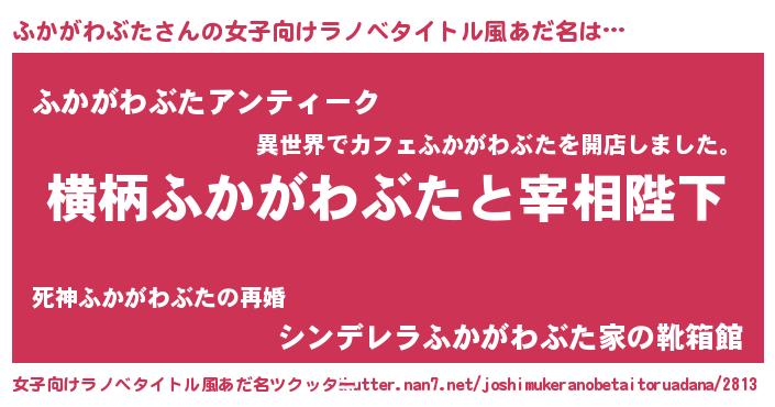 | 男性向けラノベタイトル風あだ名 | 『ふかがわぶたに滅ぼされるだけの簡単なお仕事です』 |