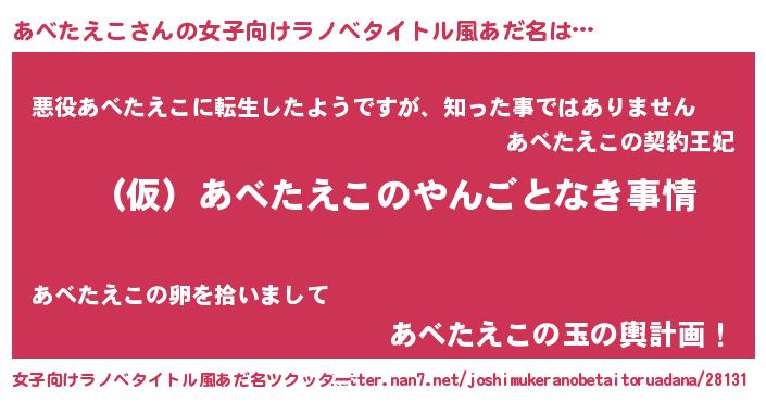 あべたえこさんの女子向けラノベタイトル風あだ名は… 『(仮)あべたえこのやんごとなき事情』『悪役あべたえこに転生したようですが、知った事ではありません』『あべたえこの玉の輿計画!』 ツクッター #女子向けラノベタイトル風あだ名ツクッター http://tkutter.nan7.net/joshimukeranobetaitoruadana/28131/