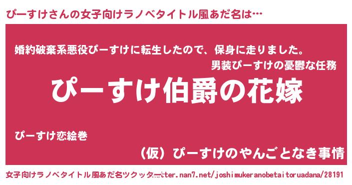 | 男性向けラノベタイトル風あだ名 | 『うちの娘の為ならば、俺はもしかしたらぴーすけも倒せるかもしれない。』 |