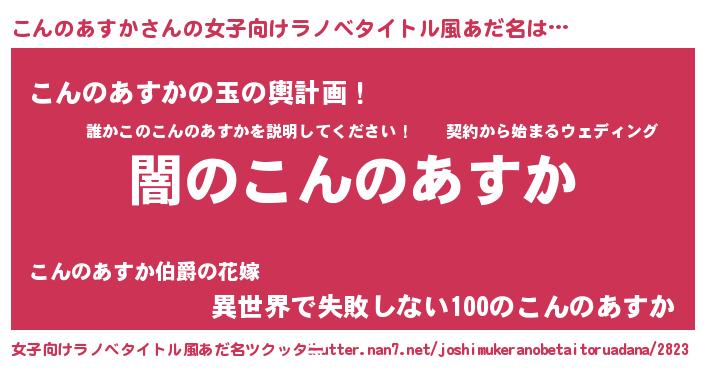 | 男性向けラノベタイトル風あだ名 | 『Re:こんのあすかから始める異世界生活』 |
