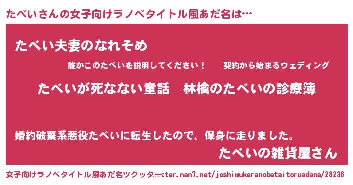 | 男性向けラノベタイトル風あだ名 | 『魔弾の王とたべい』『タベイスレイヤー』 |