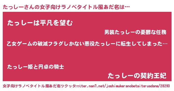 | 男性向けラノベタイトル風あだ名 | 『この素晴らしい世界にたっしーを!』 |