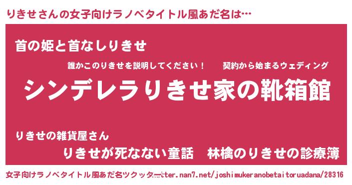 | 男性向けラノベタイトル風あだ名 | 『冴えないりきせの育てかた』 |