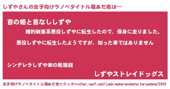 | 胡散臭い通販商品みたいなあだ名 | 『あなたにだけ特別に提供する世界で10本だけ現存している希少なブランデー…その名も「しずや」』 |