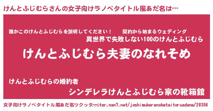 けんとふじむらさんの女子向けラノベタイトル風あだ名は… 『けんとふじむら夫妻のなれそめ』『誰かこのけんとふじむらを説明してください! ~契約から始まるウェディング~』『シンデレラけんとふじむら家の靴箱館』 ツクッター #女子向けラノベタイトル風あだ名ツクッター http://tkutter.nan7.net/joshimukeranobetaitoruadana/28356/