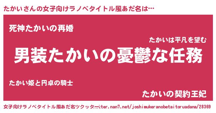 | 男性向けラノベタイトル風あだ名 | 『うちのたかいが世界を掌握している!』 |