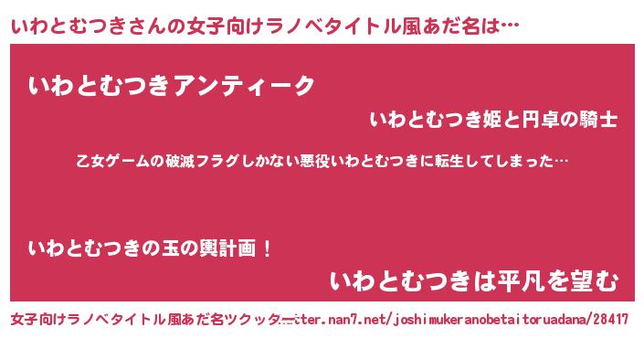 | 男性向けラノベタイトル風あだ名 | 『この素晴らしい世界にいわとむつきを!』 |