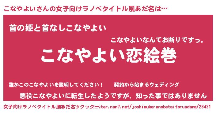 | 男性向けラノベタイトル風あだ名 | 『おまえをオタクにしてやるから、俺をこなやよいにしてくれ! 』 |