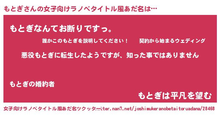 | 男性向けラノベタイトル風あだ名 | 『この素晴らしい世界にもとぎを!』 |