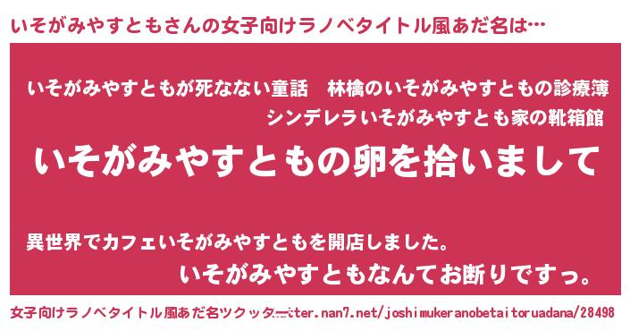| 男性向けラノベタイトル風あだ名 | 『いそがみやすともの嫁は女の子じゃないと思った?』 |