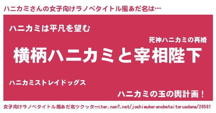 ハニカミさんの女子向けラノベタイトル風あだ名は… 『横柄ハニカミと宰相陛下』『ハニカミは平凡を望む』『ハニカミの玉の輿計画!』 ツクッター #女子向けラノベタイトル風あだ名ツクッター http://tkutter.nan7.net/joshimukeranobetaitoruadana/28561/