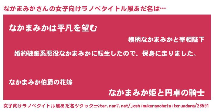 | 男性向けラノベタイトル風あだ名 | 『転生したらなかまみかだった件』 |