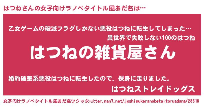 | 男性向けラノベタイトル風あだ名 | 『やはりはつねの青春ラブコメはまちがっている 』 |