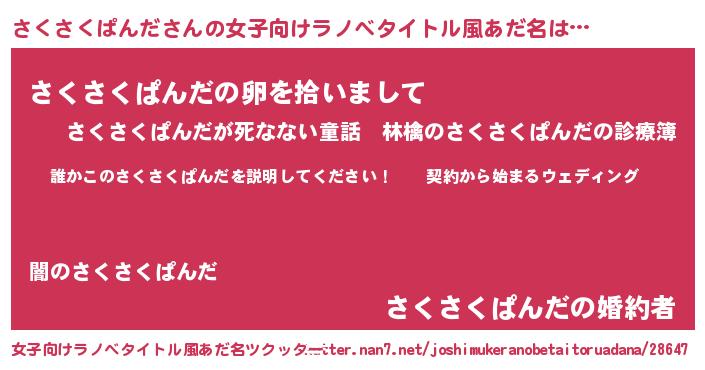 | 男性向けラノベタイトル風あだ名 | 『サクサクパンダアートオンライン』 |