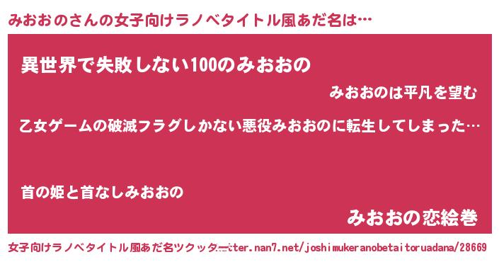 | 男性向けラノベタイトル風あだ名 | 『魔弾の王とみおおの』 |