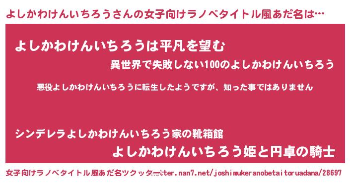 | 男性向けラノベタイトル風あだ名 | 『この素晴らしい世界によしかわけんいちろうを!』 |