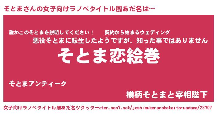 そとまさんの女子向けラノベタイトル風あだ名は… 『そとま恋絵巻』『誰かこのそとまを説明してください! ~契約から始まるウェディング~』『横柄そとまと宰相陛下』 ツクッター #女子向けラノベタイトル風あだ名ツクッター http://tkutter.nan7.net/joshimukeranobetaitoruadana/28707/