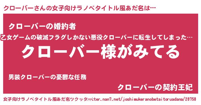 | 男性向けラノベタイトル風あだ名 | 『クローバーの嫁は女の子じゃないと思った?』 |