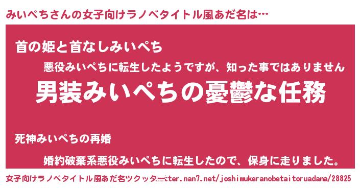 | 男性向けラノベタイトル風あだ名 | 『うちのみいぺちが世界を掌握している!』 |