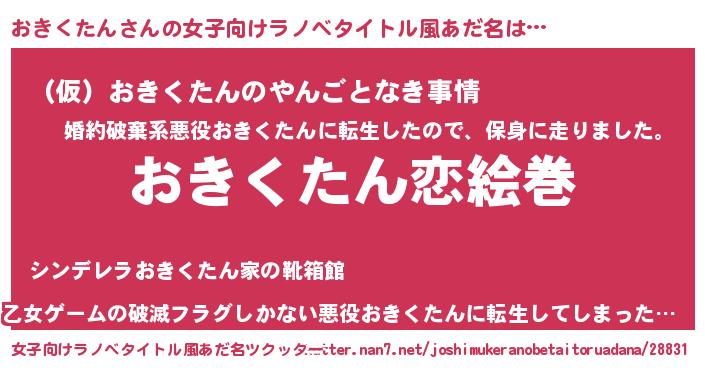 | 男性向けラノベタイトル風あだ名 | 『おまえをオタクにしてやるから、俺をおきくたんにしてくれ! 』 |