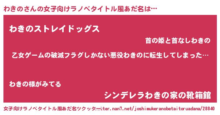 | 男性向けラノベタイトル風あだ名 | 『この素晴らしい世界にわきのを!』 |